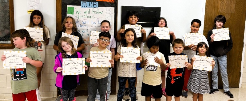 September Students of the Month were recently recognized with a certificate and a free book from the book vending machine. Pictured are: Back Row: Lilly Albiston, Dylan Shipman, Nora Reiber, Damian Beartrack, Izabelle Albiston, Qinton Paukei and Kenny Ross. Front Row: Jayden Courverler, Penelope Cain, Caleb Garza-Chacon, Luna Black, Floyd Birdshead, Kamryn WhiteEagle and Kate Hubbard