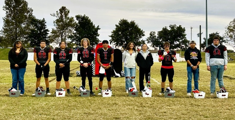 Seniors and their parents were recognized for their dedication in participating in fall sports/activites. The ceremony took place before the last HS home football game of the season. Pictured are: (L-R) Mirylie Spottedcorn, Logan Sealy-Castleberry, Trae LeFlore, Kameron Kiener, Sergio Pineda, Hollis Harrall, Tonya Olsen, Kaleb Branson, Donnie Spottedcorn, and Hestin Pratt.