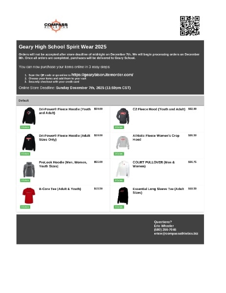 The Geary Bison 2025 Spirit Wear Store is officially open! All proceeds go directly toward supporting our students and athletes—every purchase helps! Online orders will be taken until Dec. 7.