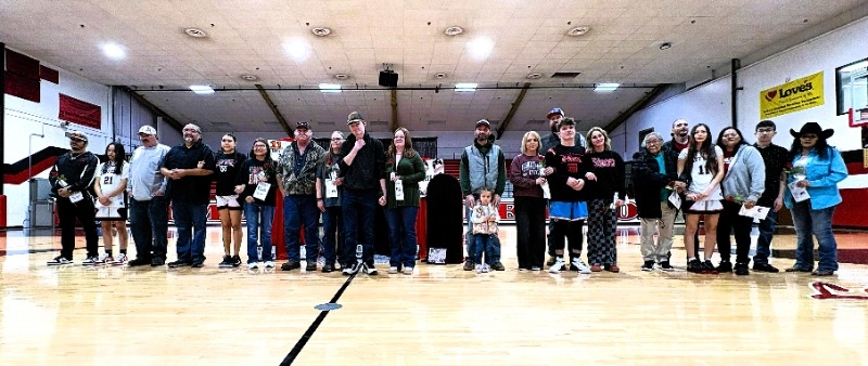 Six seniors and their families were recognized during Senior Night for basketball and E-sports. They are: (L to R) Tiara Johnson (basketball), Carmen Littleraven (basketball), Jayrivers Cooper (E-sports), Kaleb Branson (basketball), Tonya Olsen (basketball), and Calixton Silva (E-sports). The ceremony took place before the basketball game with Pathways Friday night. It was a great night for the Bison with the girls winning 44-14 and the boys winning 67-56.